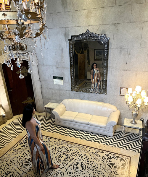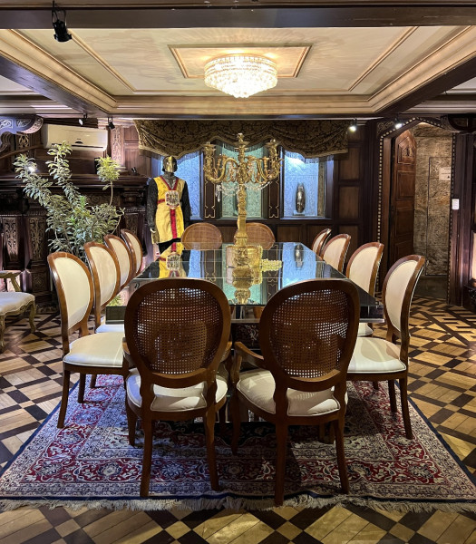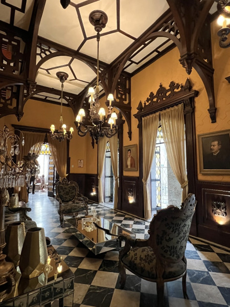 As portas e janelas são do mais puro jacarandá, com ferragens inglesas. Os vitrais são austríacos e finalizados aos mínimos detalhes. O hall com as escadarias e o teto de jacarandá, é todo trabalhado. Há vitrais com o brasão da família, bibliotecas com estantes esculpidas em relevo e um exuberante jardim natural cercando a mansão.