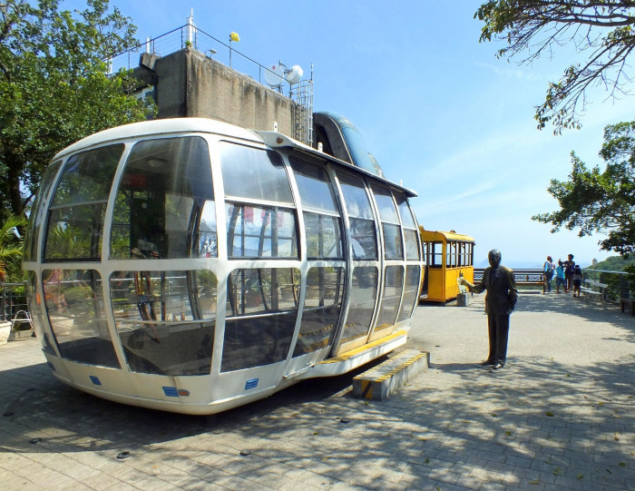 Os bondinhos antigos ficam expostos lá no alto do Morro da Urca.