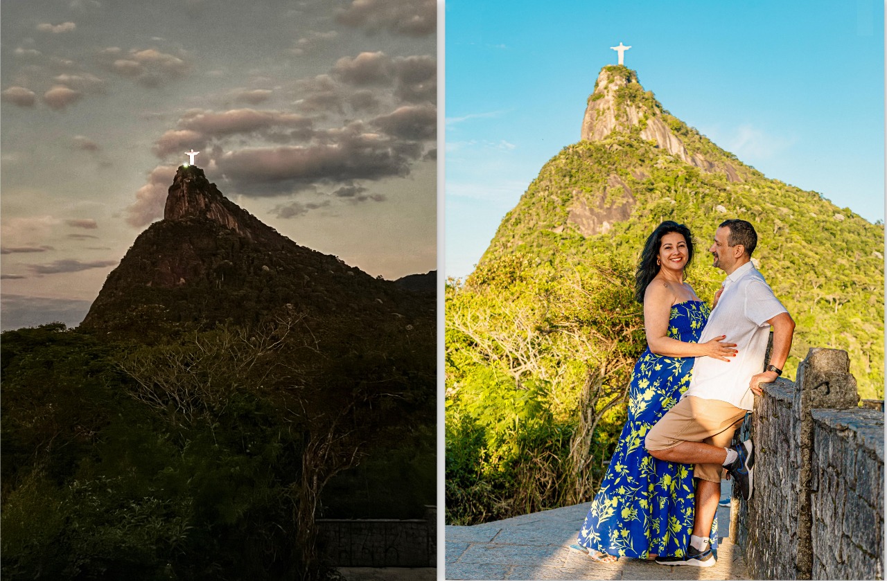 Do mirante dá pra ver o Cristo Redentor de um ângulo bem especial. Nós chegamos com o dia ainda escuro e vimos o Cristo iluminado pelos holofotes. À medida que o dia vai clareando, forma-se esse cenário maravilhoso que mais parece uma pintura!