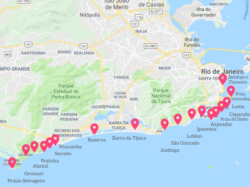 Abaixo, mapa das principais praias do Rio de Janeiro: