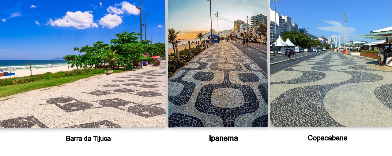 O desenho geométrico dos calçadões das praias do Rio de Janeiro tornou-se um dos símbolos icônicos da cidade. Os calçadões são reconhecidos como parte da cultura carioca e são apreciados por sua beleza e história. As calçadas são feitas por mosaicos de pedras portuguesas em um padrão geométrico em preto e branco. Todos os calçadões são feitos com esse material, só o que muda é o desenho. Em Copacabana são ondas. Na Barra são peixes. Já em Ipanema, o desenho geométrico é abstrato. As pedras portuguesas tornaram-se um símbolo do Rio de Janeiro. Hoje, o Rio possui mais de 1.200 milhões de metros quadrados de calçamento com pedras portuguesas.