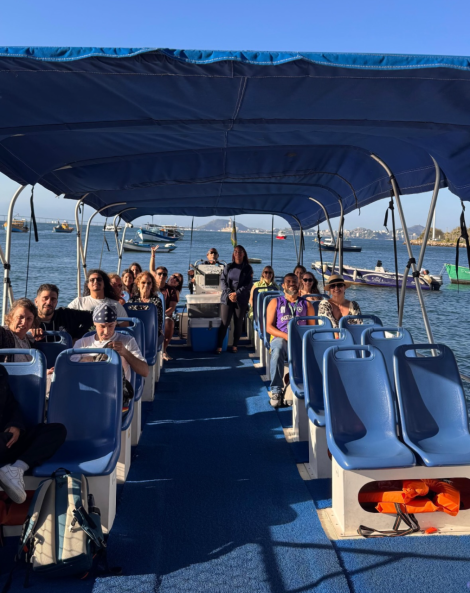 O barco é tipo um catamarã, todo aberto e não tem janelas. É propício pra gente observar a paisagem sem nenhuma interferência.