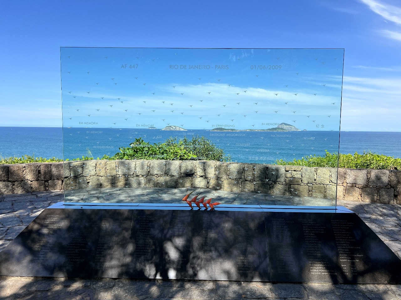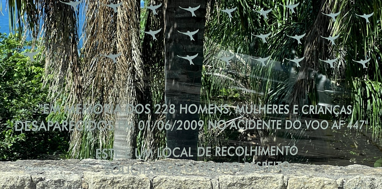 Descendo a escadaria do primeiro mirante, chegamos ao segundo mirante, bem bonito também. Nesse mirante tem um monumento em homenagem às vítimas do acidente aéreo da Air France que aconteceu em 2009, matando todos que estavam a bordo. O voo ia do Rio à Paris, mas caiu no Oceano Atlântico.